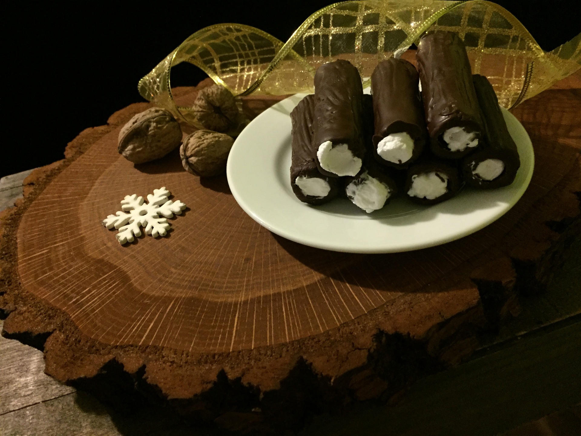kastrůlku s dvojitým dnem dáme čokoládu a kakaové máslo, necháme rozpustit. Trubičky pak natíram čokoládovou polevou a opět dám do lednice na delší dobu, aby čokoláda pěkne na trubičkách ztuhla. Když ztuhne, pomocí jedné prázdne trubičky vytlačím druhou z těsta. Trubičky mi krásně drželi, takže vůbec nemusíte mít strach, že by to bylo náročné. Pak naplníme šlehačkou z kokosové smetany.